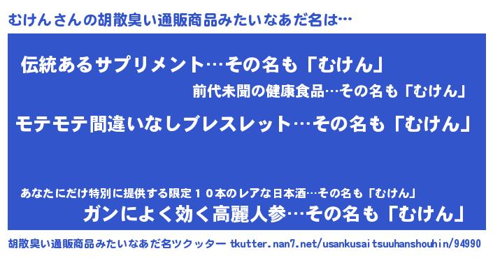 | 男性向けラノベタイトル風あだ名 | 『むけんの憂鬱』『緋弾のムケン』 |