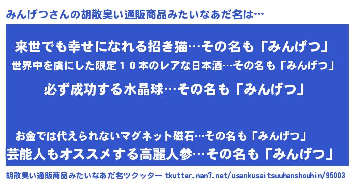 | ヘコむあだ名 | 『みんにゅー』『みんげつ(小並感)』 |