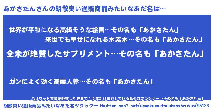 | 男性向けラノベタイトル風あだ名 | 『あかさたんの嫁は女の子じゃないと思った?』 |