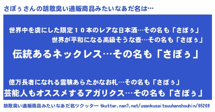 | 意味不明あだ名 | 『とにかく怪しいさぼぅ』『自称さぼぅ』 |