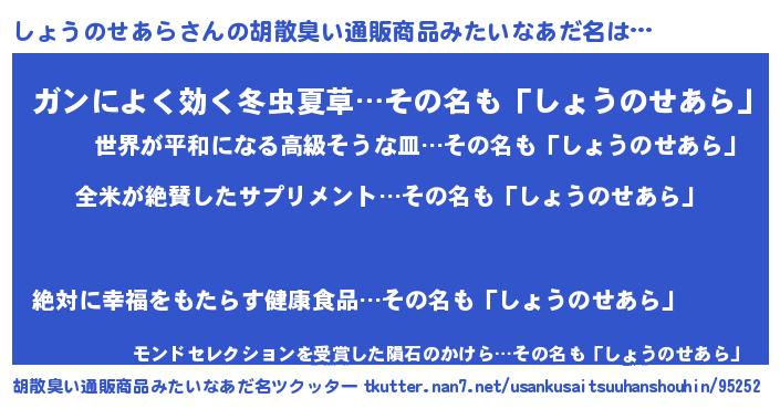 | 意味不明あだ名 | 『とにかく怪しいしょうのせあら』 |