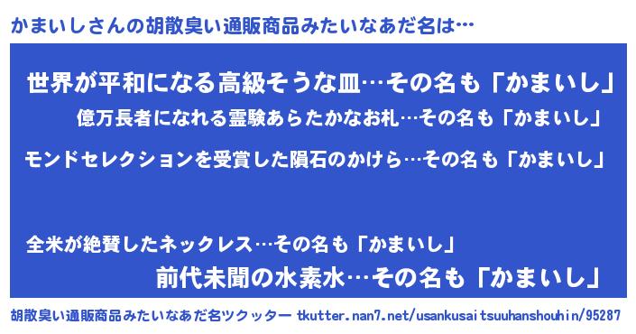 | 男性向けラノベタイトル風あだ名 | 『かまいしに滅ぼされるだけの簡単なお仕事です』 |