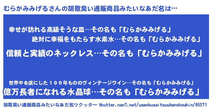 | 男性向けラノベタイトル風あだ名 | 『ダンジョンにむらかみみげるを求めるのは間違っているだろうか』 |