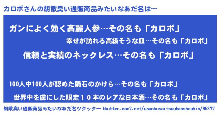 | 男性向けラノベタイトル風あだ名 | 『カロボスレイヤー』『魔弾の王とカロボ』 |