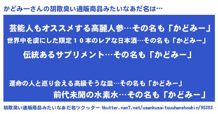 | 男性向けラノベタイトル風あだ名 | 『ダンジョンにかどみーを求めるのは間違っているだろうか』 |