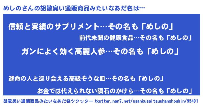 | 意味不明あだ名 | 『自称めしの』『とにかく怪しいめしの』 |