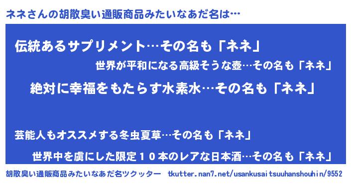 | ヘコむあだ名 | 『ネネ(苦笑)』『ネネ太郎』『豆乳』 |