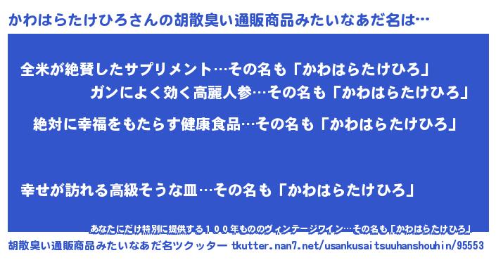 | ヘコむあだ名 | 『かわはらたけひろ(爆)』『かわっちょ』 |