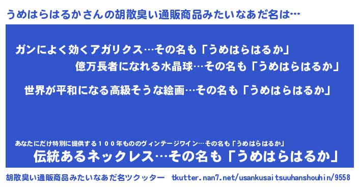 | 男性向けラノベタイトル風あだ名 | 『やはりうめはらはるかの青春ラブコメはまちがっている 』 |