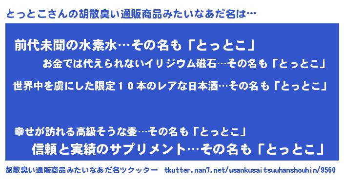 | 男性向けラノベタイトル風あだ名 | 『この素晴らしい世界にとっとこを!』 |