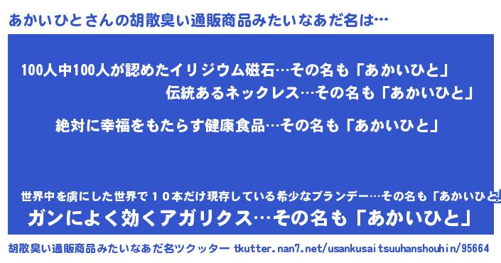 | 男性向けラノベタイトル風あだ名 | 『あかいひとという概念が存在しない退屈な世界 』 |