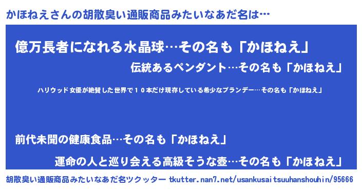 | 意味不明あだ名 | 『住所不定無職かほねえ(81歳)』 |