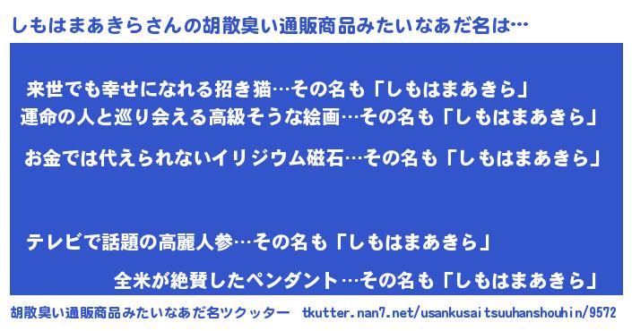 | ヘコむあだ名 | 『しもはまあきら(笑)』『しもを』 |