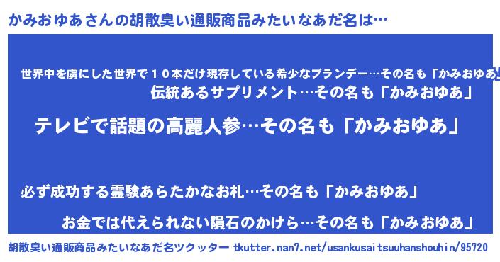| 男性向けラノベタイトル風あだ名 | 『Re:かみおゆあから始める異世界生活』 |