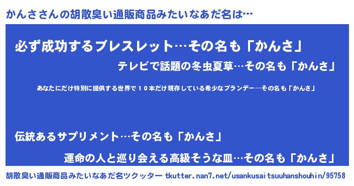 | 意味不明あだ名 | 『住所不定無職かんさ(81歳)』『自称かんさ』 |