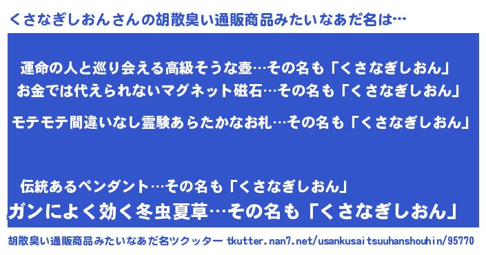 | 男性向けラノベタイトル風あだ名 | 『転生したらくさなぎしおんだった件』 |