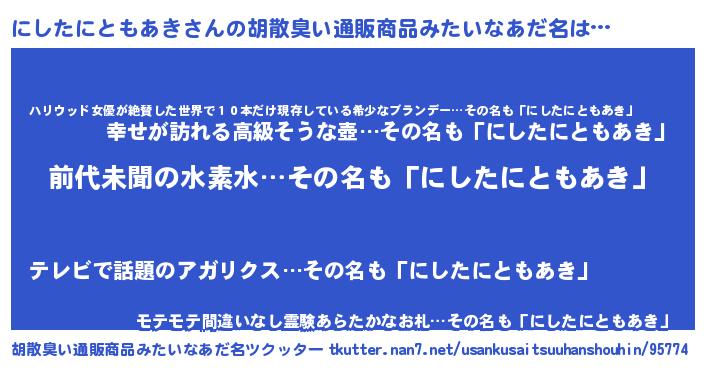 | ヘコむあだ名 | 『にしたにともあき(遠い目)』『にしもー』 |