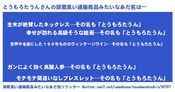 | 意味不明あだ名 | 『住所不定無職とうもろたうん(11歳)』 |