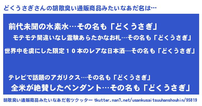| 意味不明あだ名 | 『住所不定無職どくうさぎ(47歳)』 |