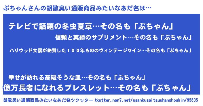 | 意味不明あだ名 | 『めかぶ科ぷちゃん属』『自称ぷちゃん』 |