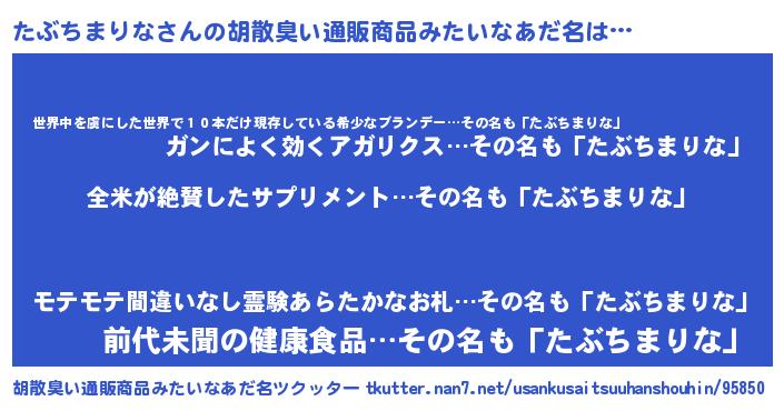 | 男性向けラノベタイトル風あだ名 | 『たぶちまりなの嫁は女の子じゃないと思った?』 |