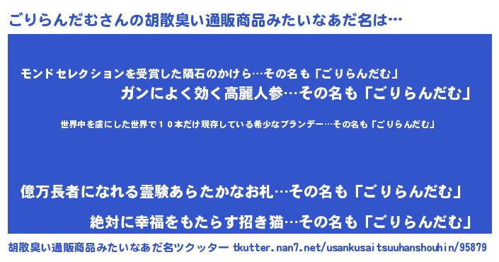 | ヘコむあだ名 | 『ごりらんだむ(震え声)』『ごりっふぃ~』 |