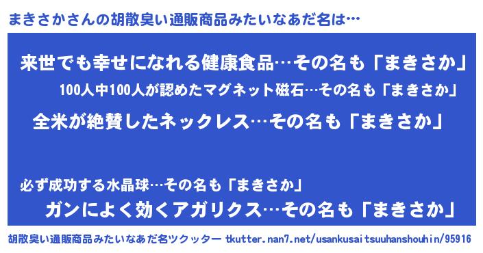 | 男性向けラノベタイトル風あだ名 | 『まきさかに滅ぼされるだけの簡単なお仕事です』 |