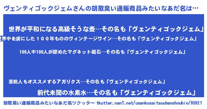 | 男性向けラノベタイトル風あだ名 | 『おまえをオタクにしてやるから、俺をヴェンティゴックジェムにしてくれ! 』 |