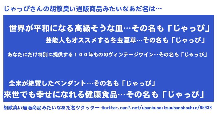 | 男性向けラノベタイトル風あだ名 | 『この素晴らしい世界にじゃっぴを!』 |