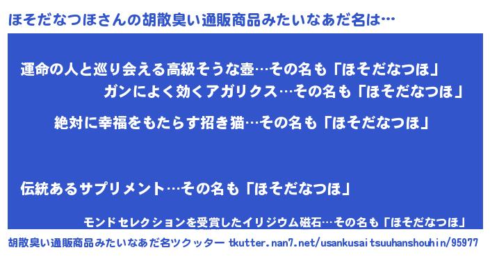 | 意味不明あだ名 | 『永久保存ほそだなつほ』 |
