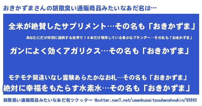 | 意味不明あだ名 | 『自称おきかずま』『永久保存おきかずま』 |