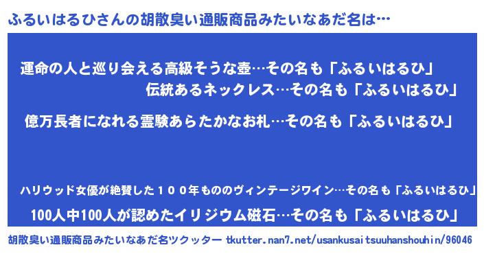 | 男性向けラノベタイトル風あだ名 | 『ふるいはるひ~年齢イコール彼女いない歴の魔法使い~』 |