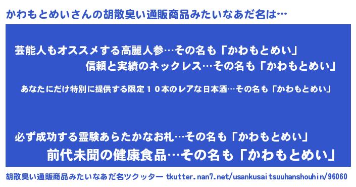 | 意味不明あだ名 | 『住所不定無職かわもとめい(53歳)』 |