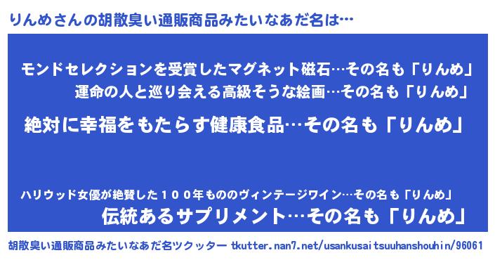 | 男性向けラノベタイトル風あだ名 | 『りんめという概念が存在しない退屈な世界 』 |