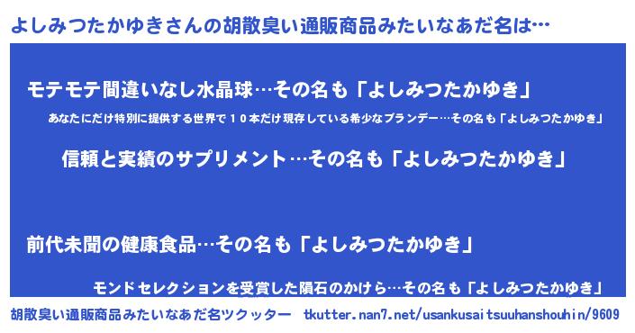 | 男性向けラノベタイトル風あだ名 | 『ダンジョンによしみつたかゆきを求めるのは間違っているだろうか』 |