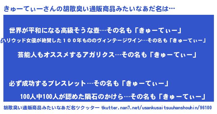 | 男性向けラノベタイトル風あだ名 | 『Re:きゅーてぃーから始める異世界生活』 |
