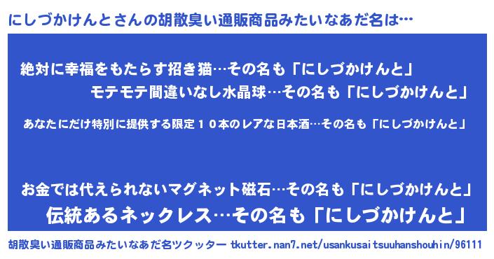 | 男性向けラノベタイトル風あだ名 | 『この素晴らしい世界ににしづかけんとを!』 |