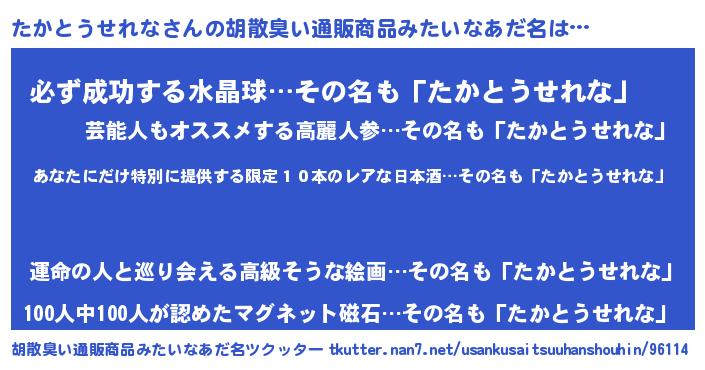 | 男性向けラノベタイトル風あだ名 | 『この素晴らしい世界にたかとうせれなを!』 |