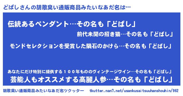 | 男性向けラノベタイトル風あだ名 | 『どばしに滅ぼされるだけの簡単なお仕事です』 |