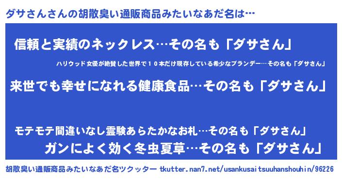 | 男性向けラノベタイトル風あだ名 | 『ダサさんという概念が存在しない退屈な世界 』 |