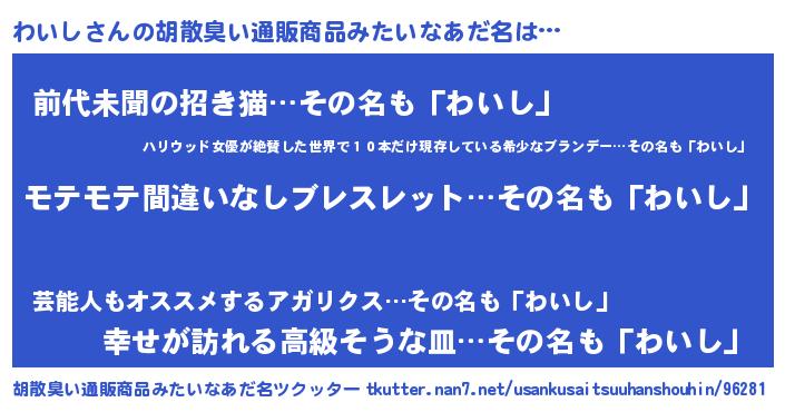 | 欧米人風あだ名 | 『マイケルわいし』『ダルビッシュわいし』 |