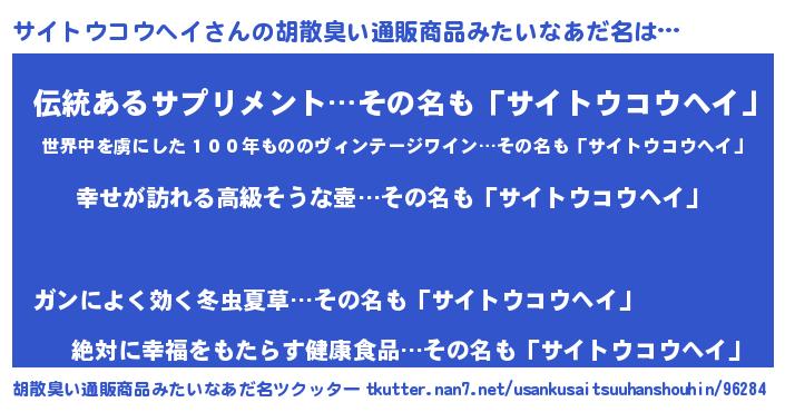 | 男性向けラノベタイトル風あだ名 | 『やはりサイトウコウヘイの青春ラブコメはまちがっている 』 |