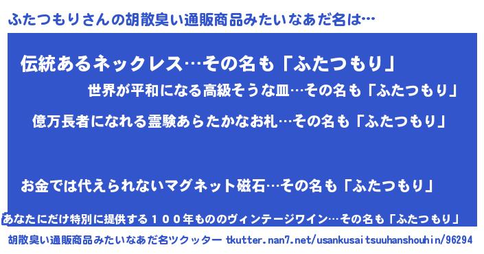 | 男性向けラノベタイトル風あだ名 | 『ふたつもり~年齢イコール彼女いない歴の魔法使い~』 |