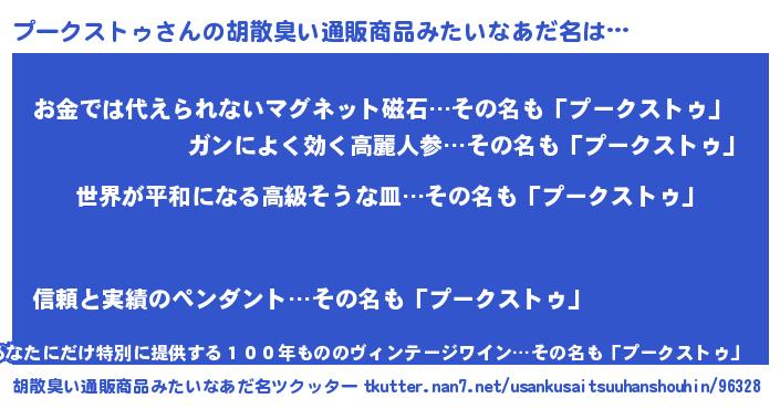 | 男性向けラノベタイトル風あだ名 | 『やはりプークストゥの青春ラブコメはまちがっている 』 |