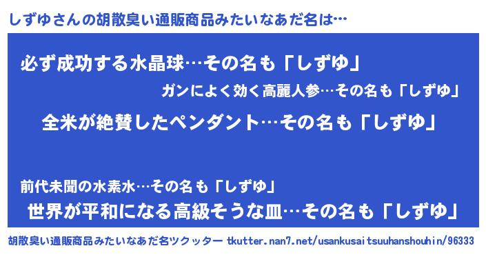 | 意味不明あだ名 | 『とにかく怪しいしずゆ』『自称しずゆ』 |
