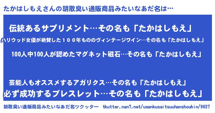 | 男性向けラノベタイトル風あだ名 | 『おまえをオタクにしてやるから、俺をたかはしもえにしてくれ! 』 |