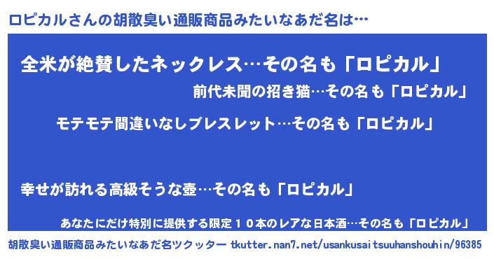 | 男性向けラノベタイトル風あだ名 | 『ロピカルの憂鬱』 |