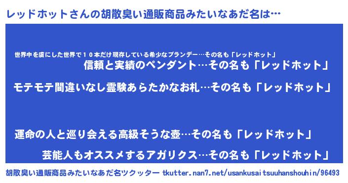 | 男性向けラノベタイトル風あだ名 | 『レッドホットに滅ぼされるだけの簡単なお仕事です』 |