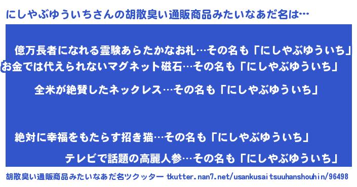 | 欧米人風あだ名 | 『ウサインにしやぶゆういち』 |