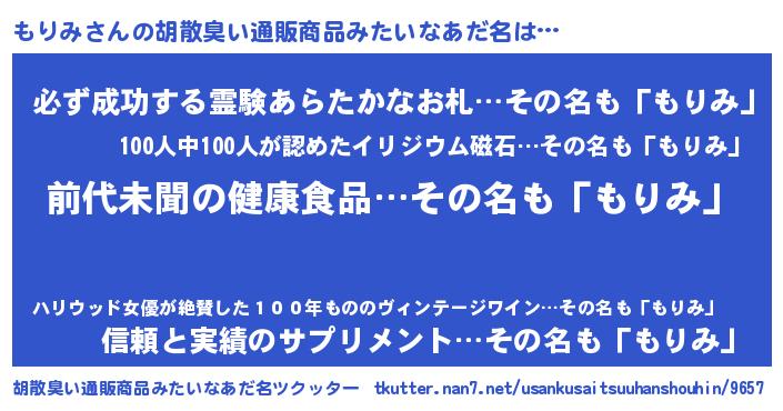 | 男性向けラノベタイトル風あだ名 | 『もりみ~年齢イコール彼女いない歴の魔法使い~』 |